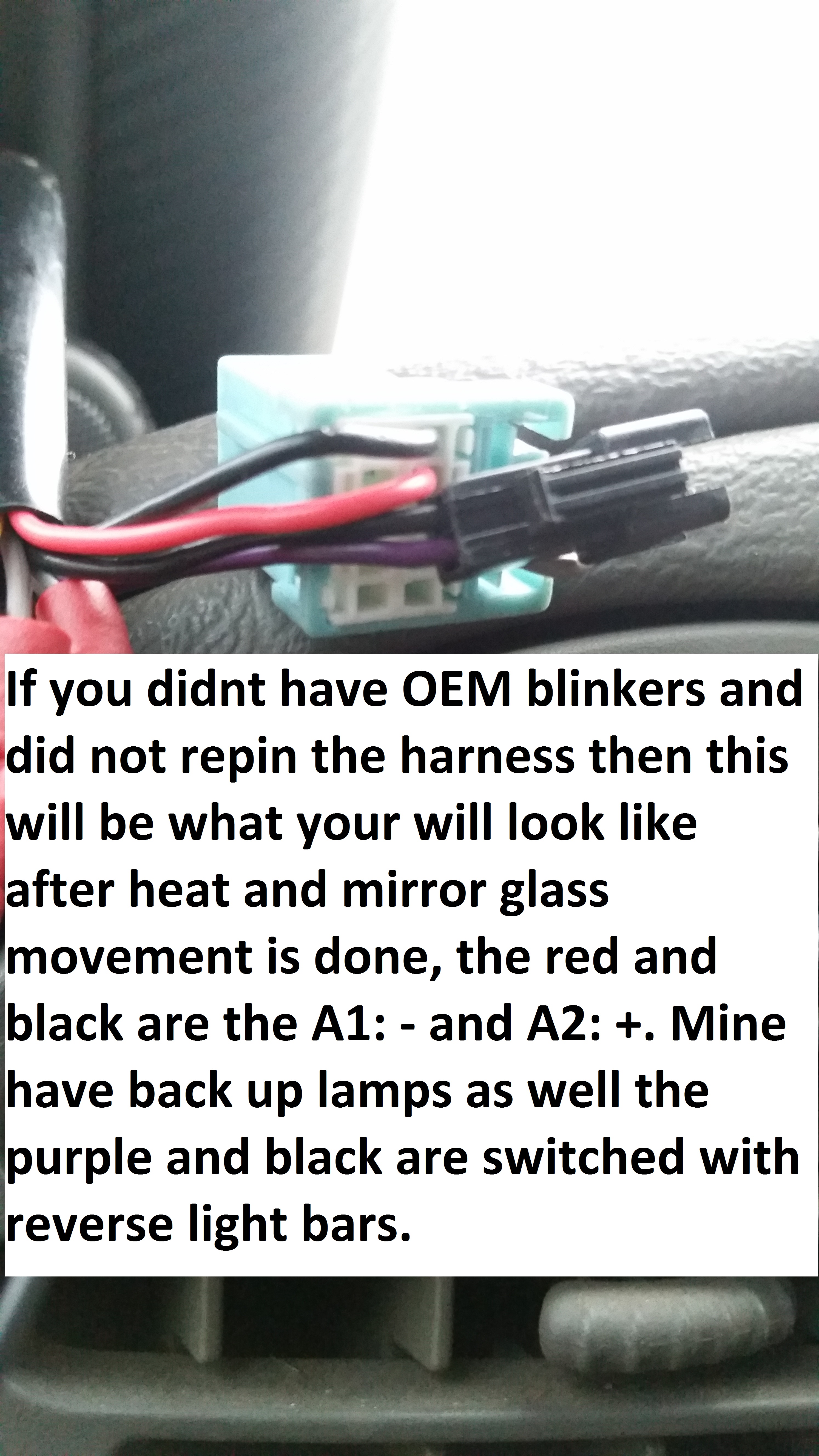 ON THE TOW MIRRORS THERE ARE 2 OR 3 CONNECTORS DEPENDING IF YOU GOT BACKUP LAMPS. BANK A IS BLUE HARNESS TOP ROW BY LATCH BANK B IS BLUE HARNESS BOTTOM ROW.