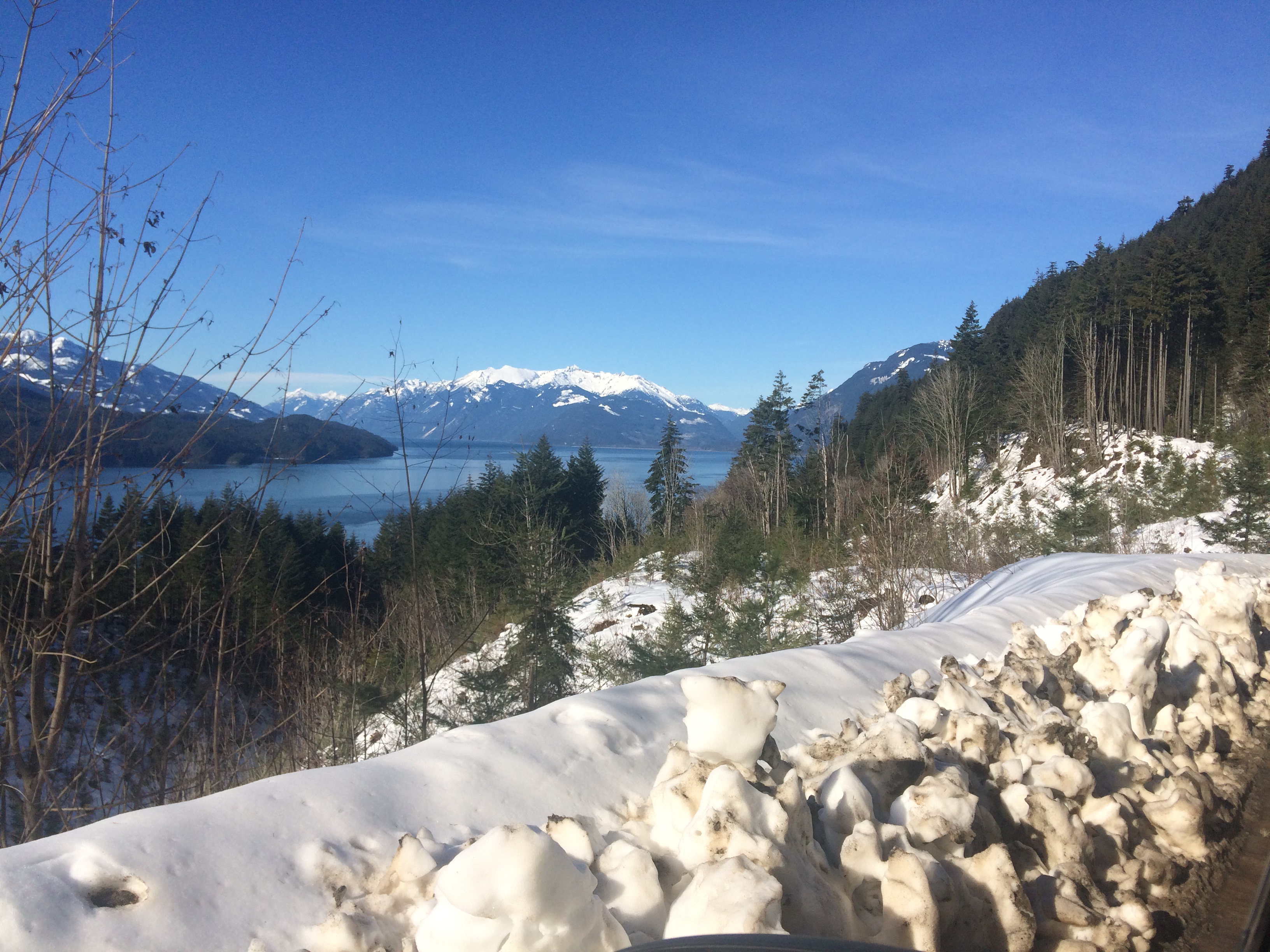 I took My buddy Jim for a run up the east side of Harrison Lake today, to check out road conditions after the recent snow storms. The main logging road was well plowed, though quite narrow, with high banks from the plowing in some sections, so meeting oncoming traffic was tricky, as both vehicles had to push the passenger side into the quite firm snowbank, and fold mirrors in to clear each other on the driver's side. Being the Family Day Holiday here in BC, we didn't have to contend with logging traffic, thank goodness.