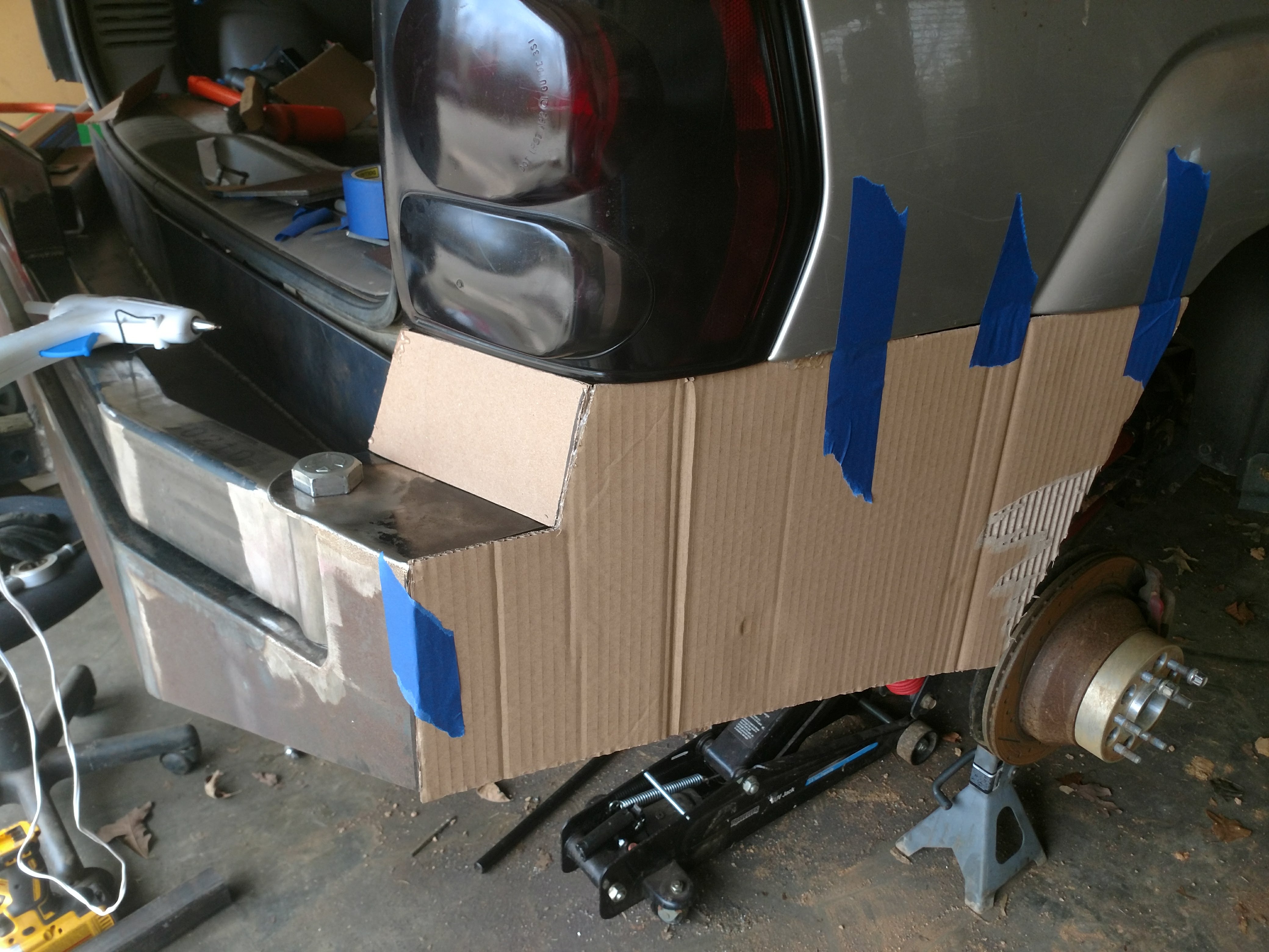 I've build most of the arm, tire mount, and passenger side of the main bumper. I added some more structure to the hinge side to minimize deflection when in the open position. I took a plasma cutter to an old front hub assembly for use as a tire mounting plate, which was full of grease and probably gave me cancer. After plasma, I ground the backside of it down relatively flat and welded it to a *45 on the end of some 2x2 to form the stick out angle. I had a piece of scrap laying on the ground from a hole saw that just so happened to fit perfectly in the center of the hub, so I used it to fill in the CV shaft hole and seal it all off. Did some more measuring and chopping until I came up with a good mounting stand and welded it to the arm. There is plenty of room for the back glass to open with the arm closed (new 35" tire shown), probably enough room for a 37".