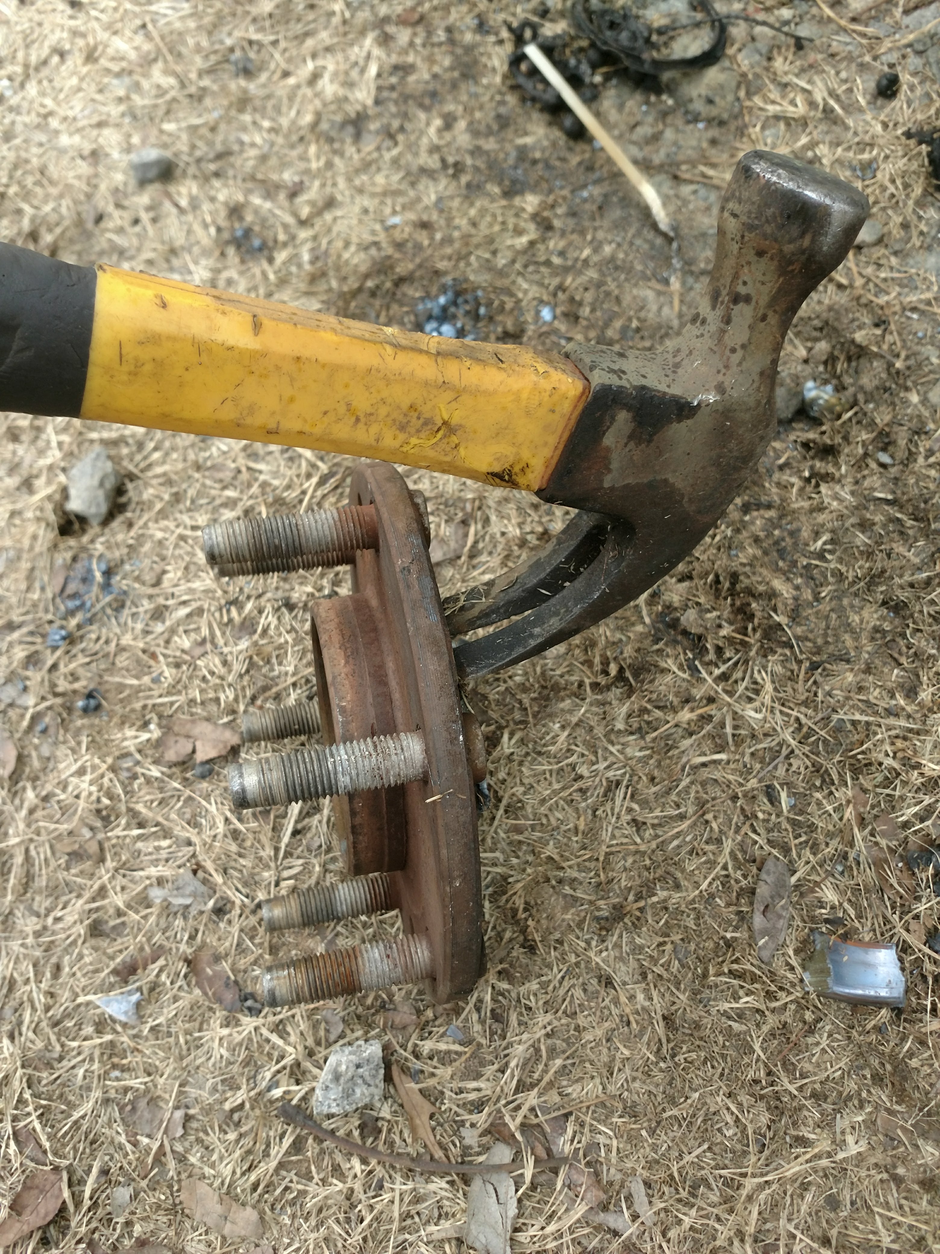 I've build most of the arm, tire mount, and passenger side of the main bumper. I added some more structure to the hinge side to minimize deflection when in the open position. I took a plasma cutter to an old front hub assembly for use as a tire mounting plate, which was full of grease and probably gave me cancer. After plasma, I ground the backside of it down relatively flat and welded it to a *45 on the end of some 2x2 to form the stick out angle. I had a piece of scrap laying on the ground from a hole saw that just so happened to fit perfectly in the center of the hub, so I used it to fill in the CV shaft hole and seal it all off. Did some more measuring and chopping until I came up with a good mounting stand and welded it to the arm. There is plenty of room for the back glass to open with the arm closed (new 35" tire shown), probably enough room for a 37".