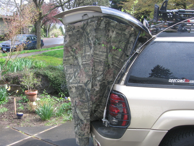 I kept trying to find some kind of cover for when the tailgate was up, kind of a changing area. It needed to be waterproof, let the wind through, but provide enough cover. So I used a 3D camo blind, and then added hooks on the door. The finished result: